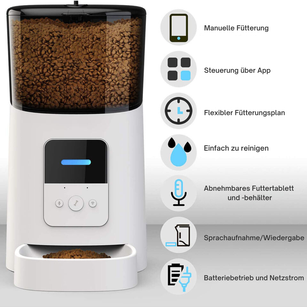 🕒 Intelligente voertechnologie: De voederautomaat stelt je in staat om tot 6 maaltijden per dag in te stellen en de portiegrootte nauwkeurig te bepalen. Je huisdier wordt altijd op het juiste moment gevoed – zelfs als je er niet bent.